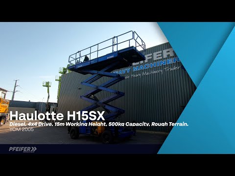 Available on requestManufacturer: Haulotte Typ: H15SX Building year: 2005 Fuel: Diesel Serial number: CD106875 Working Hours: 4.417 h Loading / lifting capacity: 500 kg Working height: 15 m Drive speed: 1.6 - 6 km/h Number of axles: 2 Drive / Steering: 4x4 Tire Condition: 100% (New) Engine manufacture / typ: Hatz / 2L41C Capacity in KW: 23,1 Capacity in HP: 31 * Extended platform length: 7,30 m. * Number of extensions: 2 x 1 m. * Turning radius - outside: 4.96 m. * Gradeability: 40%. CE (Declaration of Conformity) More detailed pictures / product movie on our website. pfeifermachinery.com Above specifications are subject to change without prior notice and subject to errors